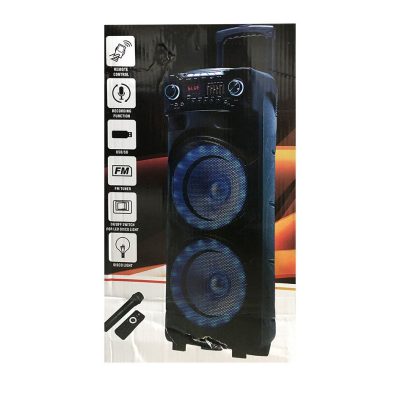 قدرت صدا 4500 وات سایز ساب 8*2 اینچ میزان شارژدهی 6 ساعت ریموت کنترل دارد میکروفن بیسیم رقص نور فول