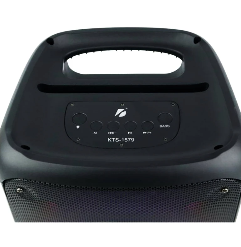 اسپیکر بی سیم قابل حمل مدل KTS-1579 مدت زمان شارژدهی در حالت پخش موسیقی حدود 1 الی 2 ساعت با میزان صدای 75 درصدی و مدت زمان مورد نیاز برای شارژ شدن حدود 3 ساعت بهرمندی از ورودی میکروفون جهت اتصال میکروفون، حساسیت سیگنال به نویز 80 دسی بل است.