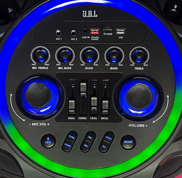 دارای دکمه های ضبط صدا و تنظیم پاسخ فرکانس یا اکولایزر و تغییر حالت استفاده و تنظیم نور اسپیکر بر روی بدنه اسپیکر/ قابلیت ضبط صدا در کارت حافظه توسط میکروفون/ تنظیم پاسخ فرکانس صدای اسپیکر در دو حالت داخلی و خارجی دارای درگاه های AUX و USB و USB-C و درگاه کارت حافظه