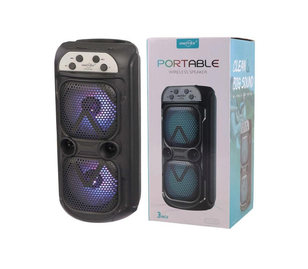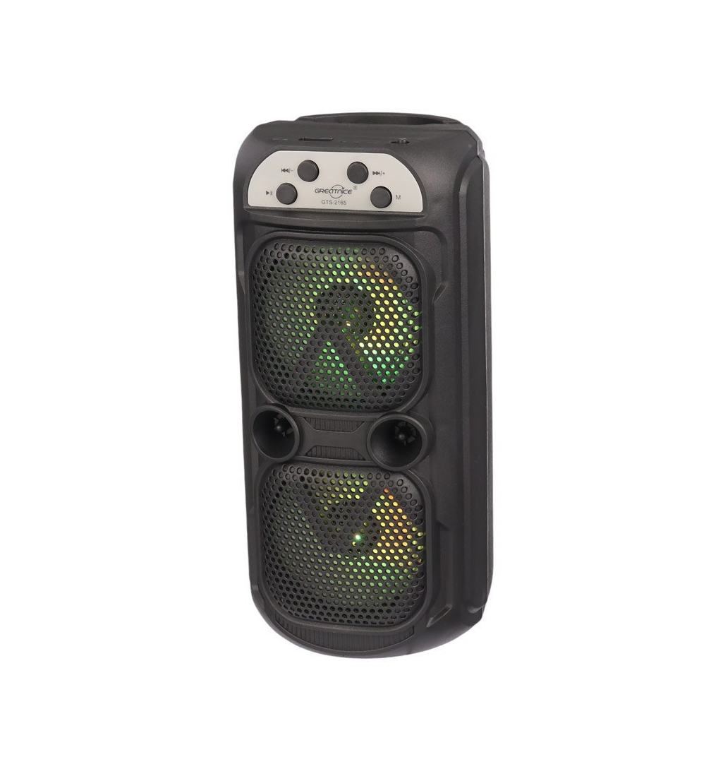 همچنین دستهی مخصوص حمل، جابجایی دستگاه را بسیار ساده میسازد.جان جانبی با استفاده از بلوتوث نسخه B، بهراحتی میتوانید اسپیکر را به موبایل، تبلت یا لپتاپ خود وصل کنید. GTS-2165 فایلهای صوتی را از طریق فلش USB یا کارت حافظه SD نیز پخش میکند. اگر به رادیوعلاقه دارید، کافیست موج FM را روی دستگاه تنظیم کنید.